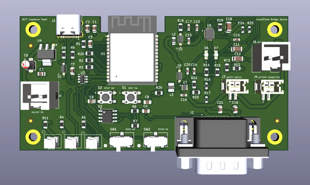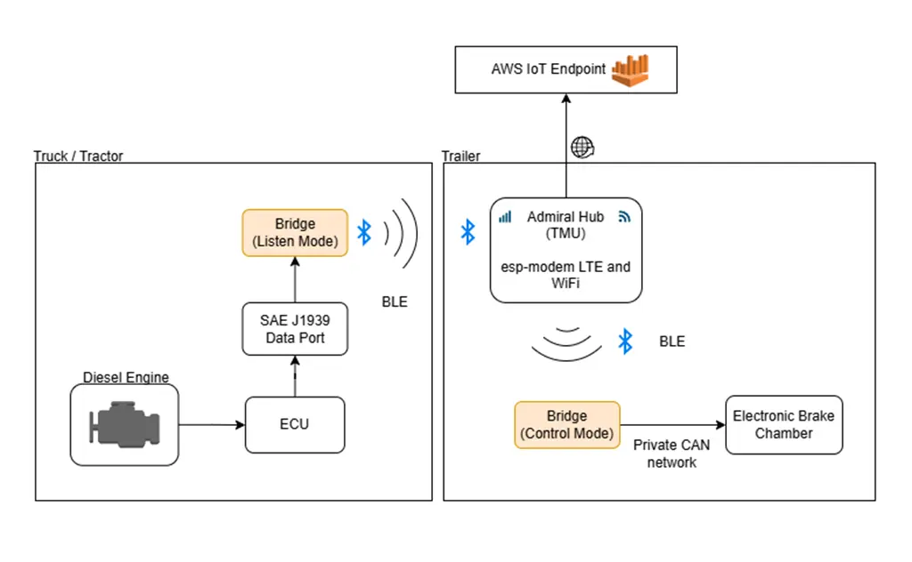For our capstone project, we were tasked with designing a bridge device that interfaces with a diesel truck’s ECU to read and parse key parameters such as ignition status, speed, and RPM, and transmit this data to the Hub via BLE, after which it is uploaded to AWS. This functionality defines the Listen Mode, in which the device is mounted in the truck’s cabin and connected to the SAE J1939 connector. The same hardware platform will also support a second mode of operation: Control Mode, where the device is mounted on the trailer and provides power to, and serves as a communication link for an electronic brake chamber.
